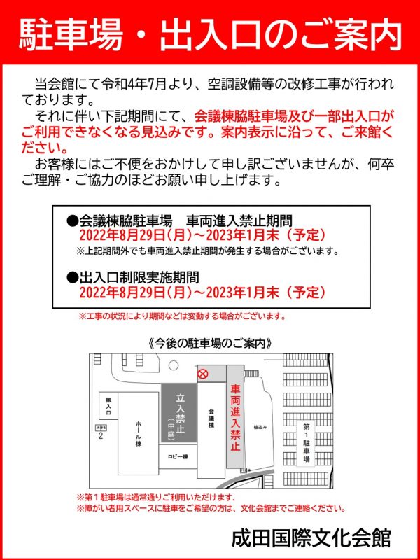 それに伴い下記期間にて、会議棟脇駐車場及び一部出入口がご利用できなくなる見込みです。